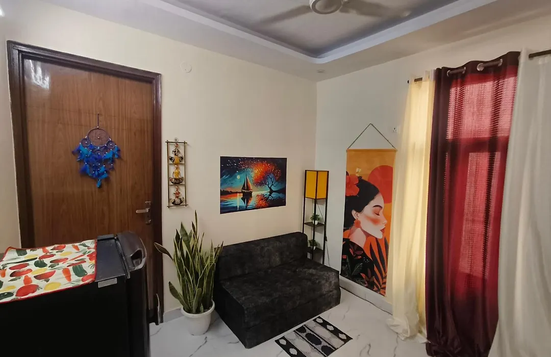 City View Private 1Bhk Flat In South Delhi dispose d'une kitchenette équipée d'un réfrigérateur et de la vaisselle. L'arrêt de bus le plus proche est Hauz Rani, situé à 450 mètres.